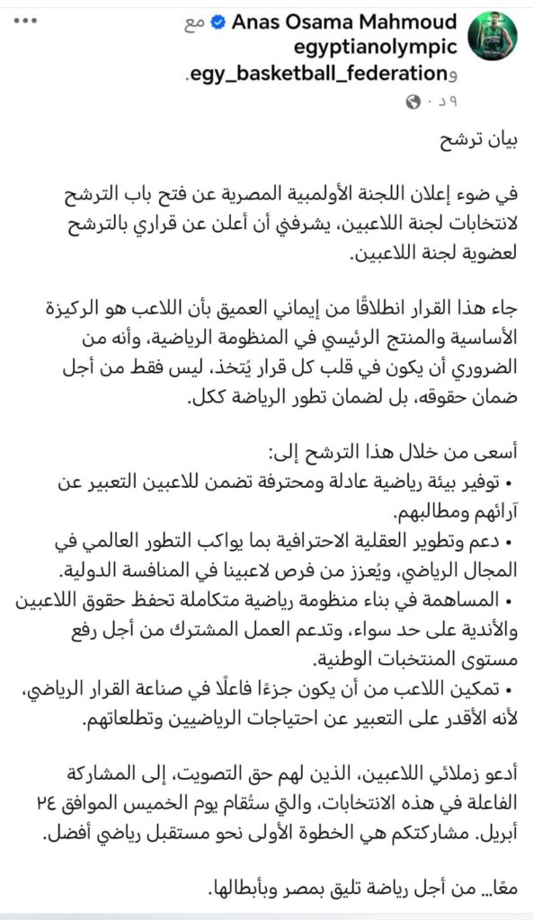 أعلن أنس أسامة، لاعب منتخب مصر لكرة السلة ونجم نادي الاتحاد السكندري، عبر حسابه الرسمي على موقع “فيس بوك”، عن قراره الترشح لعضوية لجنة اللاعبين باللجنة الأولمبية المصرية، وذلك في ضوء إعلان اللجنة عن فتح باب الترشح للانتخابات استعدادًا لدورة الألعاب الأولمبية المقبلة “لوس أنجلوس 2028”.