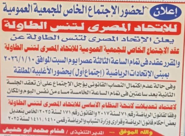 ويؤكد الاتحاد المصري لتنس الطاولة دعوته للأعضاء أصحاب الحق في الحضور والمشاركة والتصويت على البنود المطروحة، لما يمثله هذا الاجتماع من أهمية كبرى في مسيرة اللعبة وتطوير هياكلها الإدارية.
