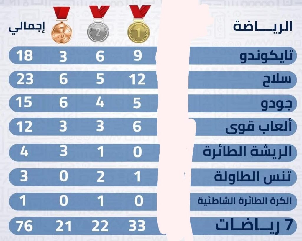 وبذلك، بلغ إجمالي ما حققته البعثة المصرية في دورة الألعاب 76 ميدالية متنوعة، بواقع 33 ميدالية ذهبية، و22 فضية، و21 برونزية، في حصاد مميز يؤكد ريادة الرياضة المصرية وتفوقها القاري.