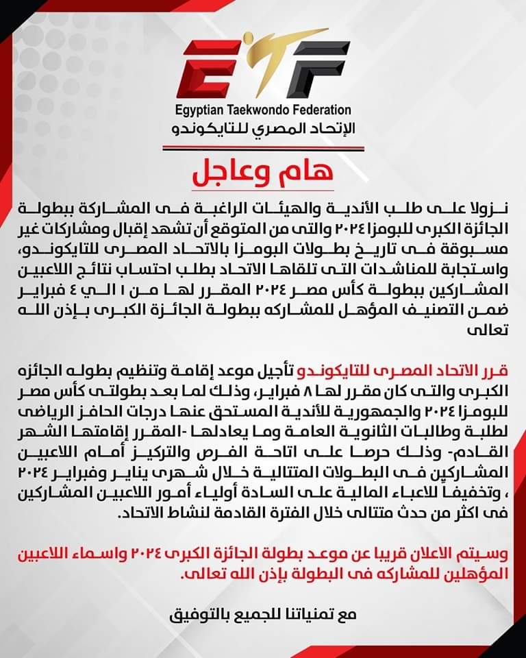واصدر اتحاد التايكوندو بيانا رسميا قال فيه: “نزولا على طلب الأندية والهيئات الراغبة فى المشاركة ببطولة الجائزة الكبرى للبومزا ٢٠٢٤ والتى من المتوقع أن تشهد إقبال ومشاركات غير مسبوقة في تاريخ بطولات البومزا بالاتحاد المصرى للتايكوندو واستجابة للمناشدات التي تلقاها الاتحاد بطلب احتساب نتائج اللاعبين المشاركين ببطولة كأس مصر ٢٠٢٤ المقرر لها من ١ الي ٤ فبراير ضمن التصنيف المؤهل للمشاركه ببطولة الجائزة الكبرى قرر الاتحاد المصرى للتايكوندو تأجيل موعد إقامة وتنظيم بطوله الجائزه الكبرى والتي كان مقرر لها ۸ فبراير، وذلك لما بعد بطولتي كأس مصر للبومزا ۲۰۲٤ والجمهورية للأندية المستحق عنها درجات الحافز الرياضي لطلبة وطالبات الثانوية العامة وما يعادلها – المقرر إقامتها الشهر القادم وذلك حرصا على اتاحة الفرص والتركيز أمام اللاعبين المشاركين في البطولات المتتالية خلال شهرى يناير وفبراير ٢٠٢٤ ، وتخفيفاً للاعباء المالية على السادة أولياء أمور اللاعبين المشاركين في اكثر من حدث متتالى خلال الفترة القادمة لنشاط الاتحاد.