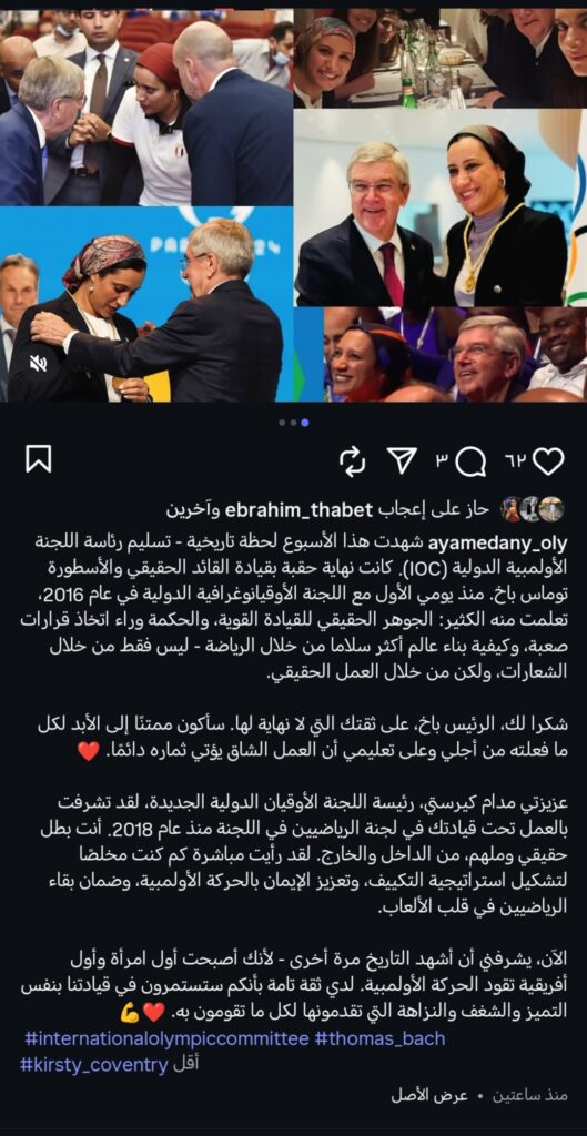 عبرت آية مدني في منشور لها عبر حسابها على “إنستجرام”، عن امتنانها العميق للرئيس المنتهية ولايته توماس باخ، مشيرة إلى أنه كان “قائدًا حقيقيًا وأسطورة”، وقالت: “منذ يومي الأول في اللجنة الأولمبية الدولية عام 2016، تعلمت منه الكثير عن جوهر القيادة القوية، وحكمة اتخاذ القرارات الصعبة، وبناء عالم أكثر سلامًا من خلال الرياضة، ليس فقط بالشعارات، بل بالفعل الحقيقي”.