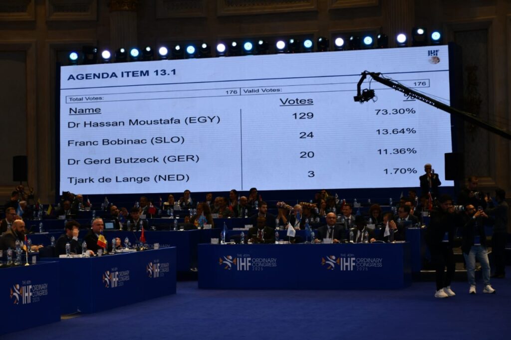 حسم الدكتور حسن مصطفى، رئيس الاتحاد الدولي لكرة اليد، سباق رئاسة الاتحاد الدولي بعد حصوله على 129 صوتا من إجمالي أصوات الجمعية العمومية، متفوقا على منافسيه الثلاثة، حيث حصل فرانك بوبيناك مرشح سلوفينيا على 24 صوتا، وجيرد بوتزيك مرشح ألمانيا على 20 صوتا، بينما نال تجارك دي لانج مرشح هولندا 3 أصوات، ليحصد حسن مصطفى الأغلبية المطلوبة ويواصل قيادته للعبة عالميا.