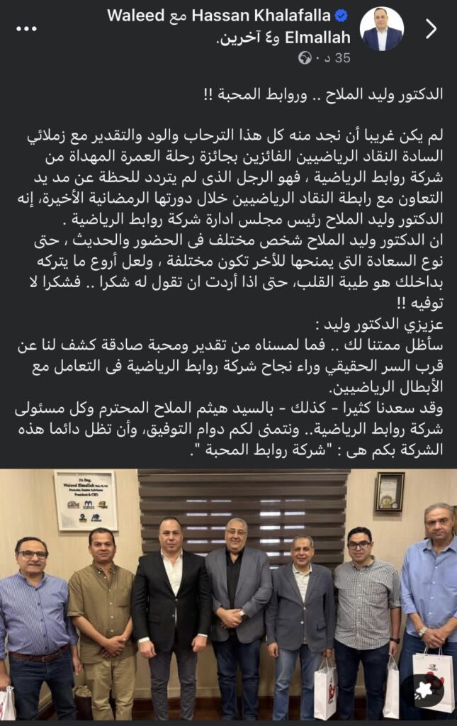 لم يكن غريبا أن نجد منه كل هذا الترحاب والود والتقدير مع زملائي السادة النقاد الرياضيين الفائزين بجائزة رحلة العمرة المهداة من شركة روابط الرياضية ، فهو الرجل الذى لم يتردد للحظة عن مد يد التعاون مع رابطة النقاد الرياضيين خلال دورتها الرمضانية الأخيرة، إنه الدكتور وليد الملاح رئيس مجلس ادارة شركة روابط الرياضية .