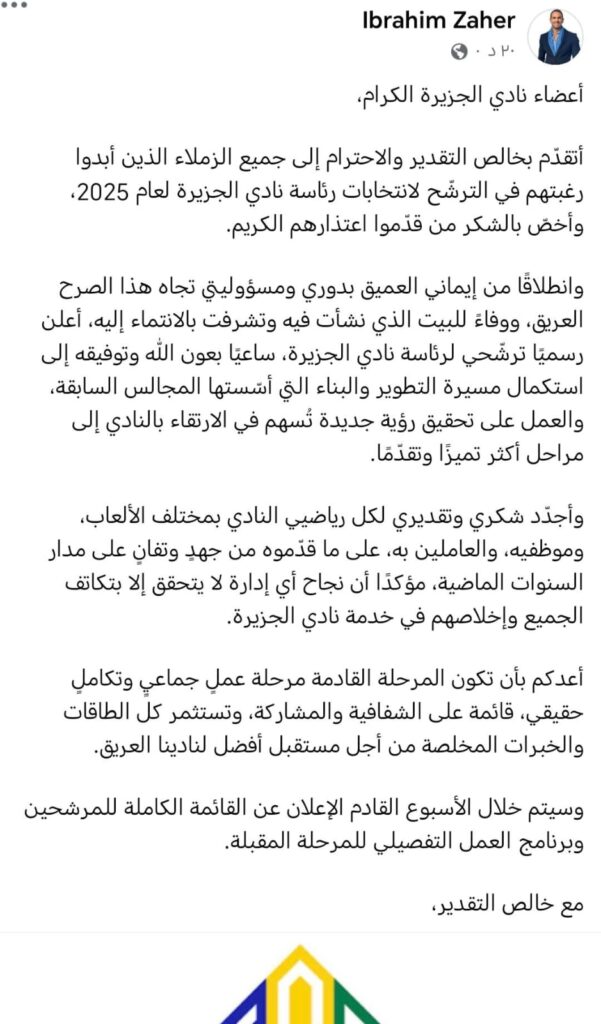 رسميًا.. إبراهيم زاهر يعلن ترشحه لرئاسة نادي الجزيرة في انتخابات 2025