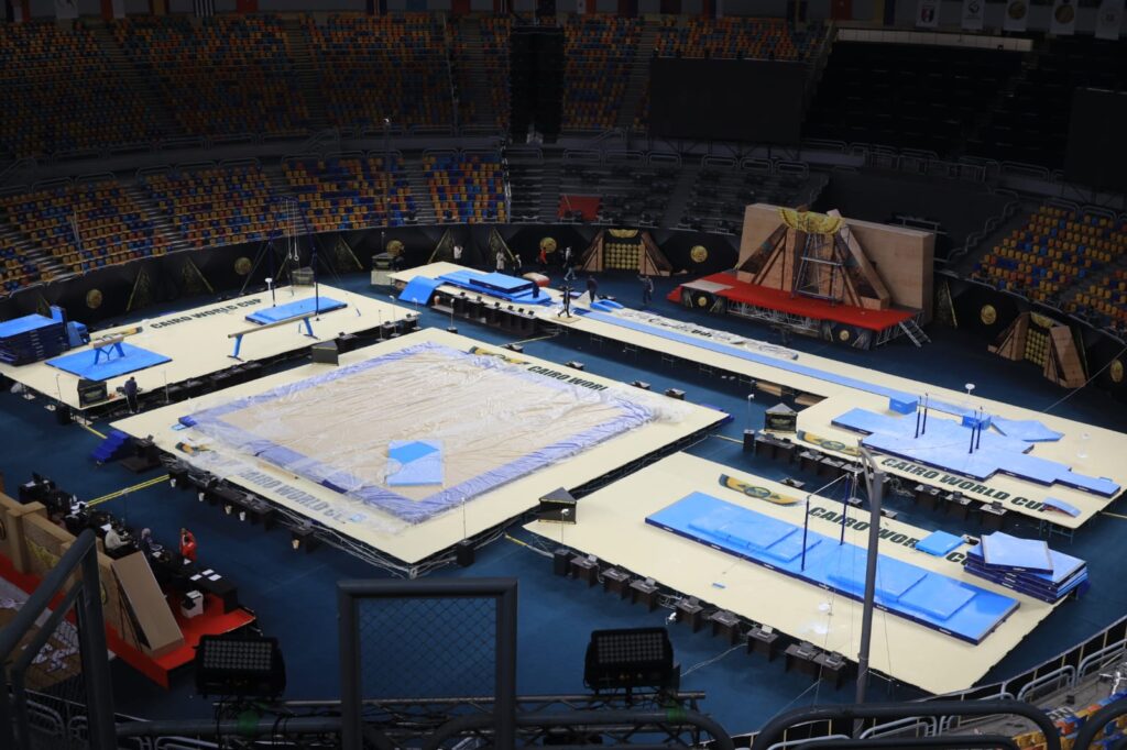 صالة استاد القاهرة تتزين لاستقبال كأس العالم للجمباز الفني