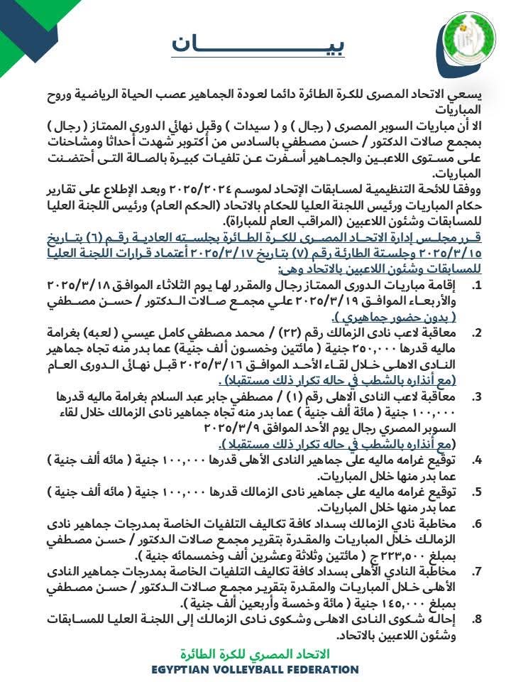 جاء ذلك رغم توقيع غرامة مالية عليه بقيمة ربع مليون جنيه وتحذير اتحاد الكرة الطائرة له من تكرار الأمر لتجنب الشطب النهائي.