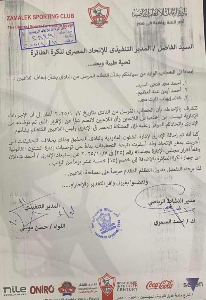 مستند/ الزمالك يخطر اتحاد الكرة الطائرة بعقوبة أحمد شعلان ومسئوليته عن سفر بعثة الإمارات