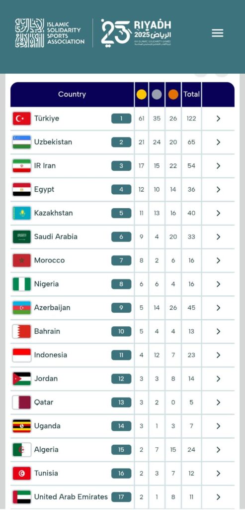 مصر تصعد للمركز الرابع في جدول ميداليات التضامن الإسلامي