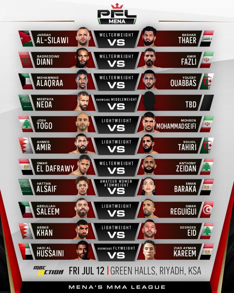 تتواصل المنافسات المصرية بدوري رابطة المقاتلين المحترفين (PFL) في “موسم الشرق الأوسط وشمال أفريقيا” حيث ستنظلق المنافسات الجديدة يوم 12 يوليو في الرياض في وزن “المتوسط والخفيف” حيث ستلتقي ايمان بركة بهتان السيف السعودية في القفص الذهبي بمنافسات الرابطة وزياد كريم سيواجهه هادي الحسيني بينما يلتقي عمر الدفراوي زيدان انطونيقال بيت موراي، الرئيس التنفيذي لرابطة المقاتلين المحترفين (PFL): “إن رابطة المقاتلين المحترفين متحمسة للعودة إلى الرياض من أجل النسخة الثانية من بطولة دول الشرق الأوسط وشمال أفريقيا.