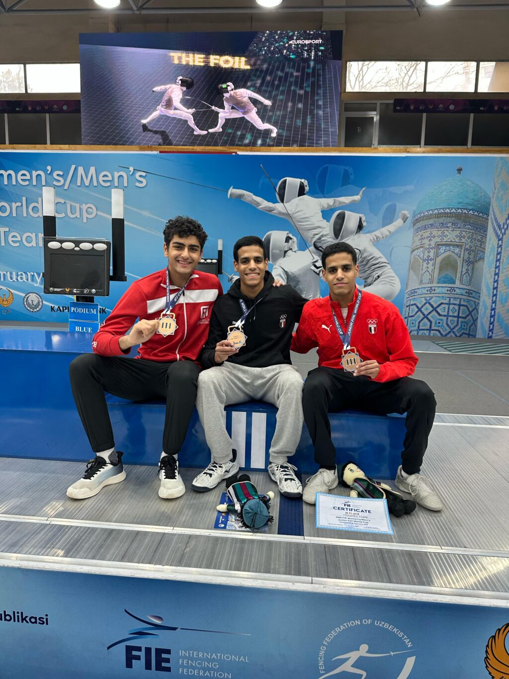 حقق المنتخب المصري لسلاح الشيش للرجال الميدالية البرونزية لأول مرة في بطولة كأس العالم للناشئين، التي أُقيمت في طشقند بأوزبكستان، بعد فوزه على منتخب أوزبكستان بنتيجة 45-35 في مباراة تحديد المركز الثالث.