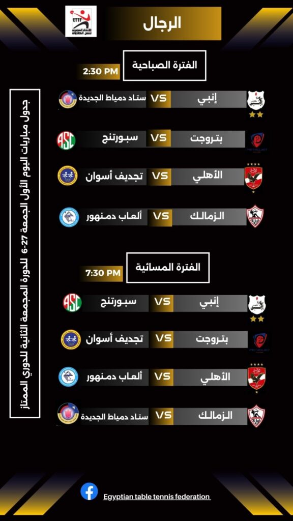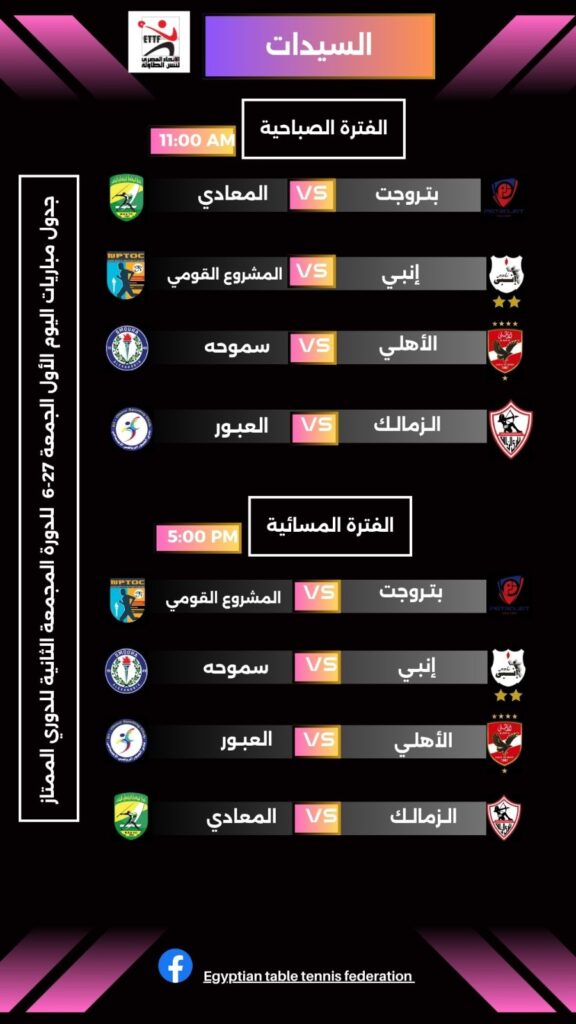 مواعيد اليوم الأول للدورة المجمعة الثانية لدوري تنس الطاولة للرجال والسيدات بالإسماعيلية