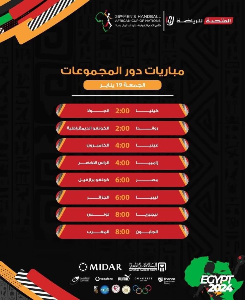 تنطلق اليوم الجمعة الجولة الثانية في دور المجموعات ببطولة أمم أفريقيا لليد للرجال، التي تستمر حتى 27 من الشهر الجاري والمؤهلة إلى أولمبياد باريس 2024.