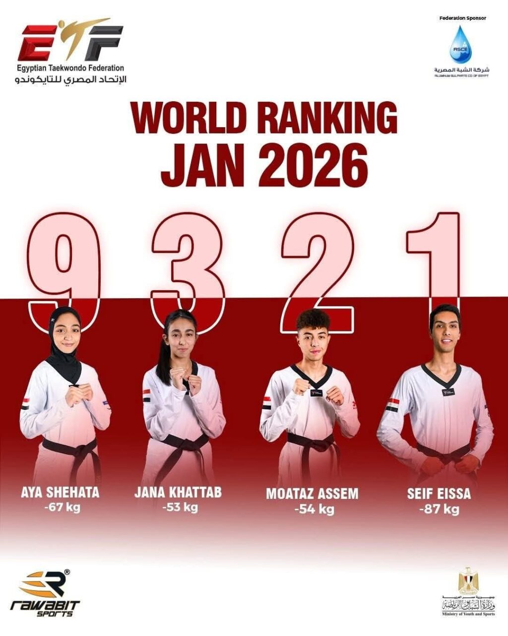 وأكد الدكتور أشرف صبحي أن هذا التفوق يعكس حجم الجهد المبذول من اللاعبين والأجهزة الفنية، والدعم المستمر الذي تقدمه الدولة المصرية للاتحادات الرياضية والأبطال، في إطار استراتيجية وزارة الشباب والرياضة الهادفة إلى إعداد أبطال قادرين على المنافسة العالمية ورفع اسم مصر عاليًا في مختلف المحافل الدولية.وأضاف وزير الشباب والرياضة أن تصدر لاعبي التايكوندو المصريين للتصنيف العالمي مع بداية عام 2026 يعد رسالة قوية تؤكد مكانة مصر المتقدمة في هذه الرياضة، ويجسد ثمار التخطيط العلمي والاستثمار في المواهب، متمنيًا لأبطال مصر مزيدًا من النجاحات والإنجازات خلال المرحلة المقبلة، خاصة في الاستحقاقات القارية والدولية المقبلة.
