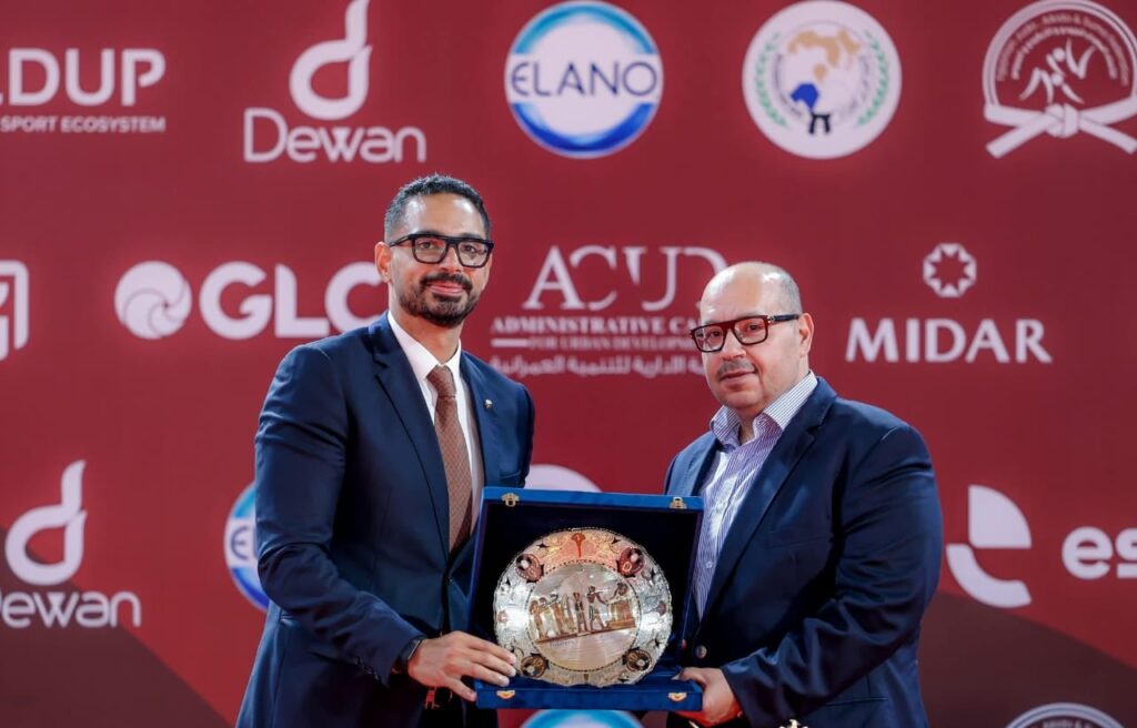 ياسر إدريس يشهد البطولة العربية للجودو ومطيع يكرمه بدرع الاتحاد