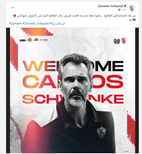 أعلن نادي الزمالك، برئاسة حسين لبيب، عن التعاقد مع البرازيلي كارلوس شوانكي، رسميا لتدريب الفريق الأول لكرة الطائرة بالقلعة البيضاء،...
